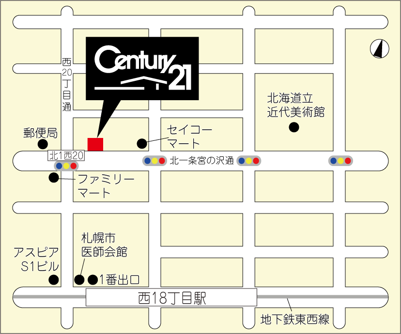 地下鉄東西線「西18丁目」駅1番出口より徒歩3分、北1条通りに弊社はあり、駐車場も完備。不動産営業経験豊富なスタッフが安心・安全のお取引をお約束致します。