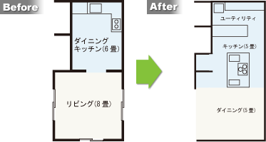 6畳のDKと8畳のリビングに小分けされた窮屈な間取りを統合。大型のアイランドキッチンを併設したLDKは、家族団らんはもちろん、ホームパーティーにも対応できる。キッチン奥にユーティリティスペースを設けたプランにより、家事の効率も大幅にアップ!