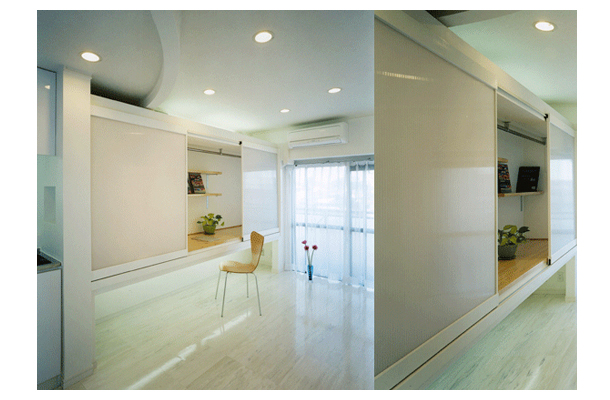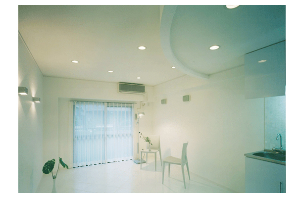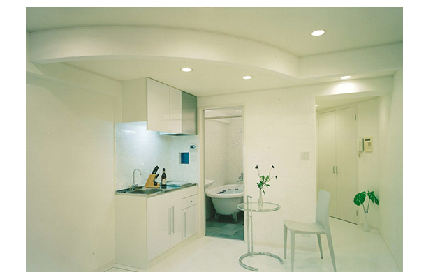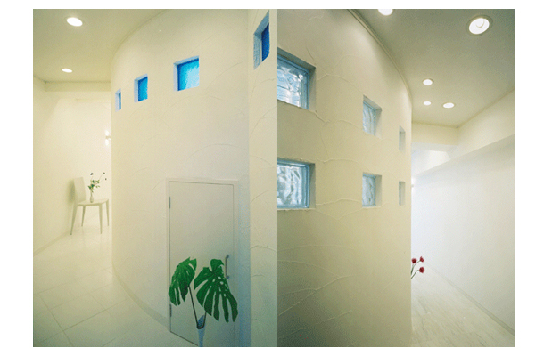 オーナーのT氏からは、「他にないような、非日常が感じられる間取りにしたい」という要望をいただいていましたから、通常のリフォーム(更新)だけでなく、プラスアルファの要素を望んでいたことは十分に理解していました。その答えとして出した結論が、玄関から大きな局面を描いて続く白い壁です。以前の間取りでは、玄関をあけるとすぐに部屋が目の前に現れるような間取りで、面白みもなく、圧迫感がありました。そこで、玄関から部屋までの間に小道を設けて、日常とは違うアーチをくぐりながら部屋に入るよう演出したのです。住宅で言うところのアプローチのような役割と言えるでしょう。