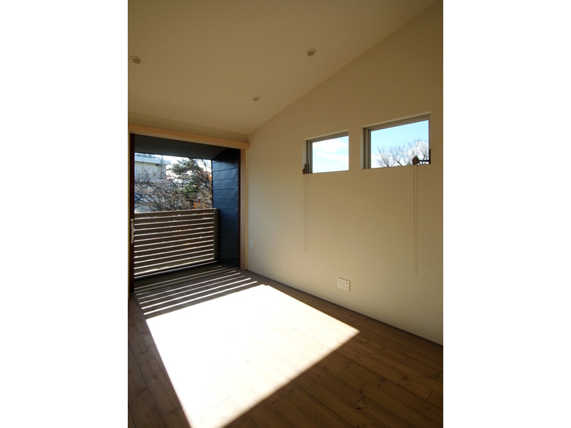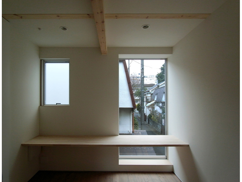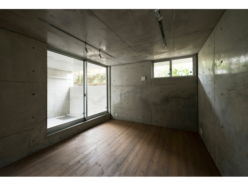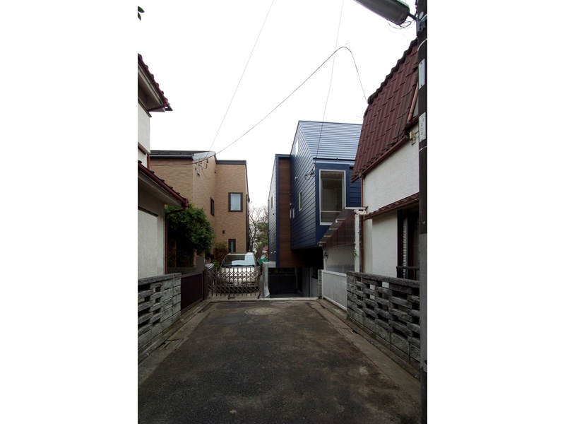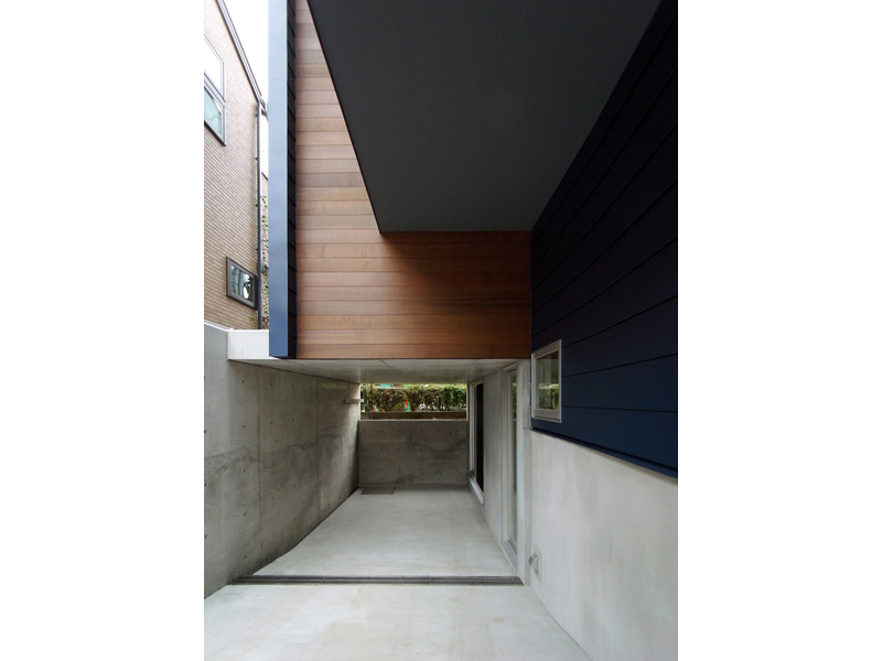 - 4m幅の私道の突き当たりにある約32坪の敷地に計画した2世帯住宅です。接道が2mしかない条件のなかで、一部の居室と駐車スペースを半地下まで掘り下げ、建物全体をスキップフロアーの構成とすることで、生活空間に加え、ご要望にあった2台分の駐車スペースを確保しました。南側は公園緑地が広がっており、各居室から異なる大きさの開口部を通して様々な高さや距離で緑を謳歌できる住まいとなっています。