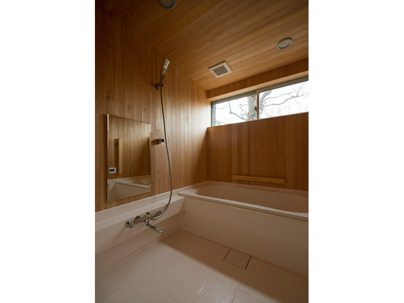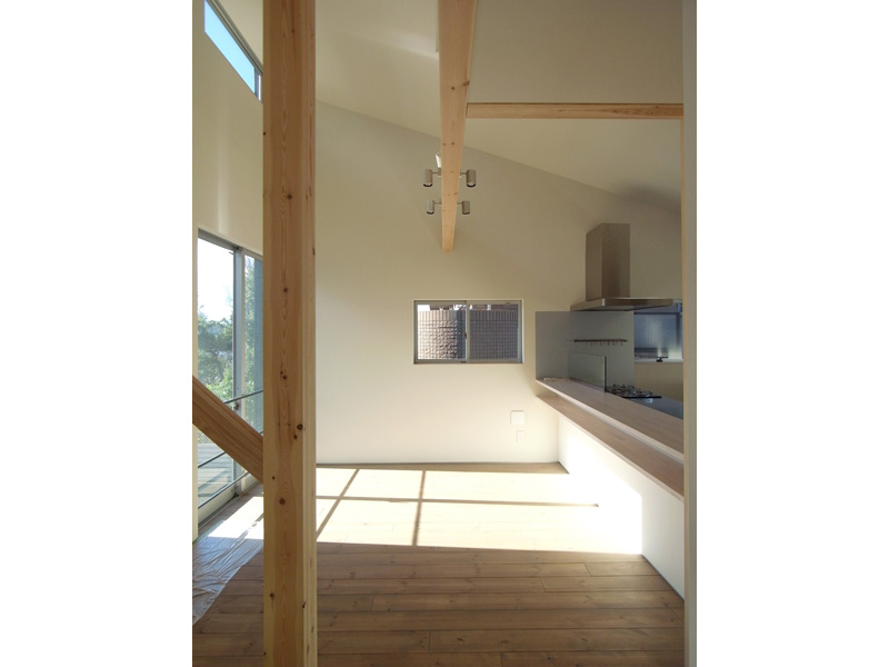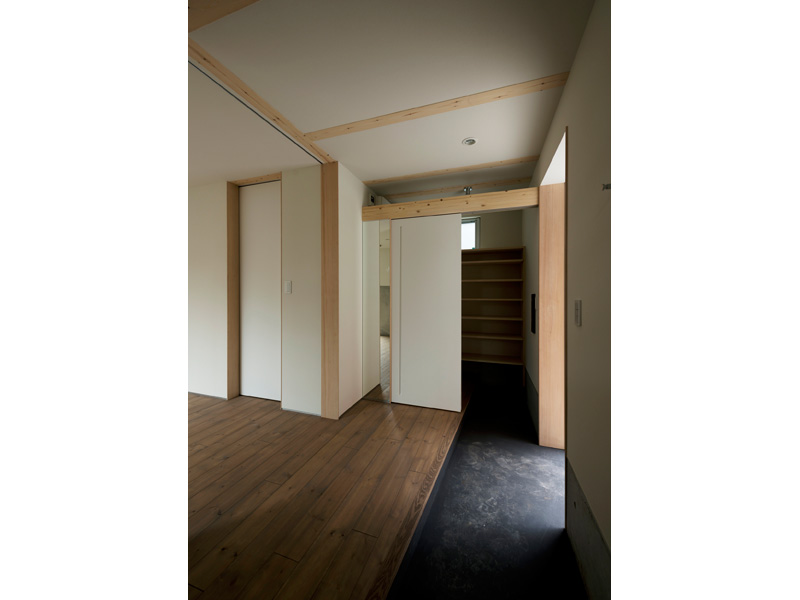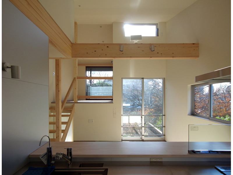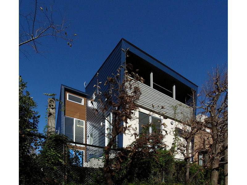 | 設計・デザインのポイント | 4m幅の私道の突き当たりにある約32坪の敷地に計画した2世帯住宅です。接道が2mしかない条件のなかで、一部の居室と駐車スペースを半地下まで掘り下げ、建物全体をスキップフロアーの構成とすることで、生活空間に加え、ご要望にあった2台分の駐車スペースを確保しました。南側は公園緑地が広がっており、各居室から異なる大きさの開口部を通して様々な高さや距離で緑を謳歌できる住まいとなっています。 | ||