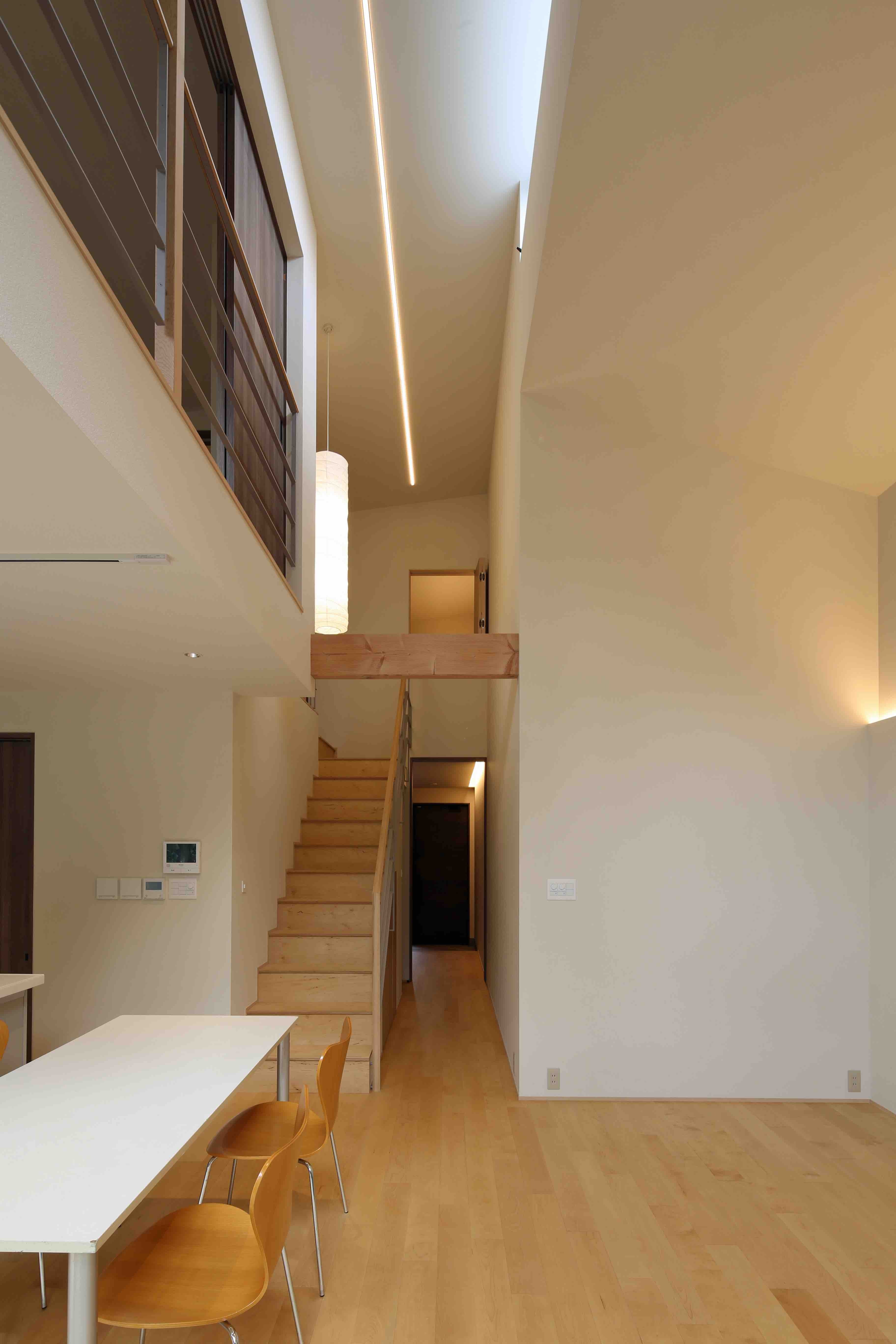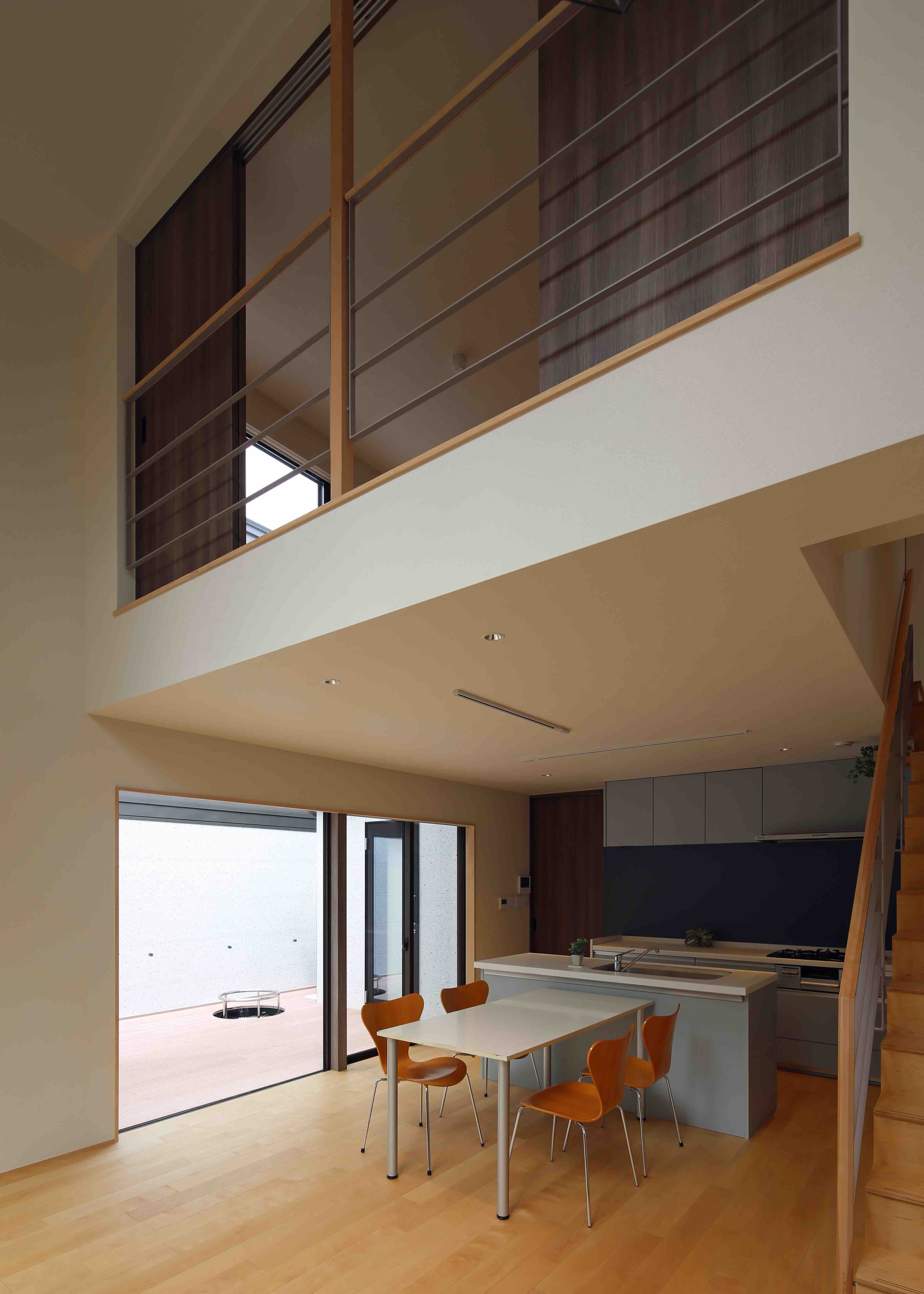 各住戸でピアノが弾けるようなグレードをめざし、視線はもとより、音や響きも相互に伝わらないように、 両者を分断しつつ、わずかな箇所で接するような配置計画としました。 それぞれの家の外形を組み合わせることで、 中庭や、プライベートな庭空間を生み出しています。 内部では吹抜を中心に開放的な住空間を展開しました。
