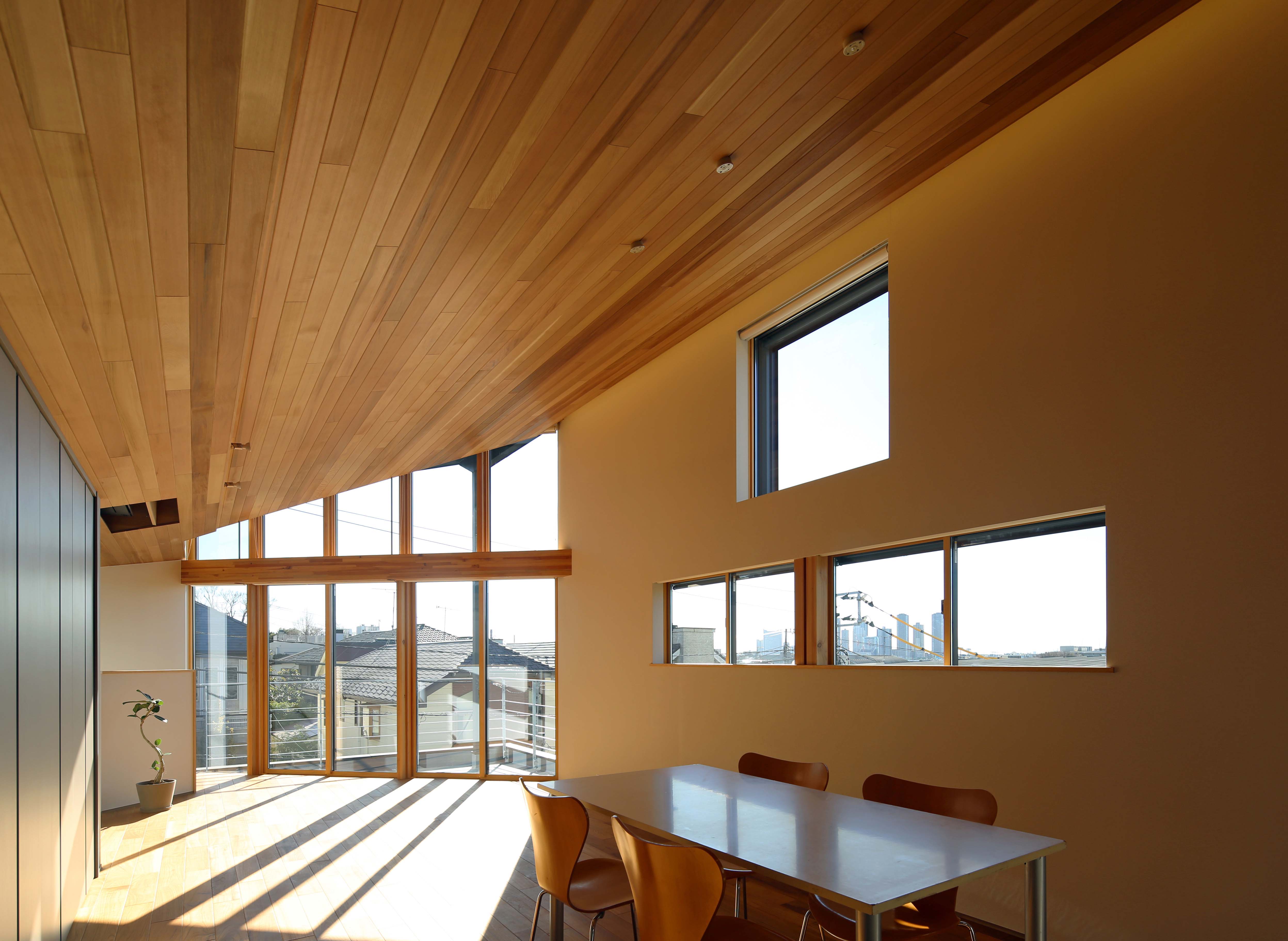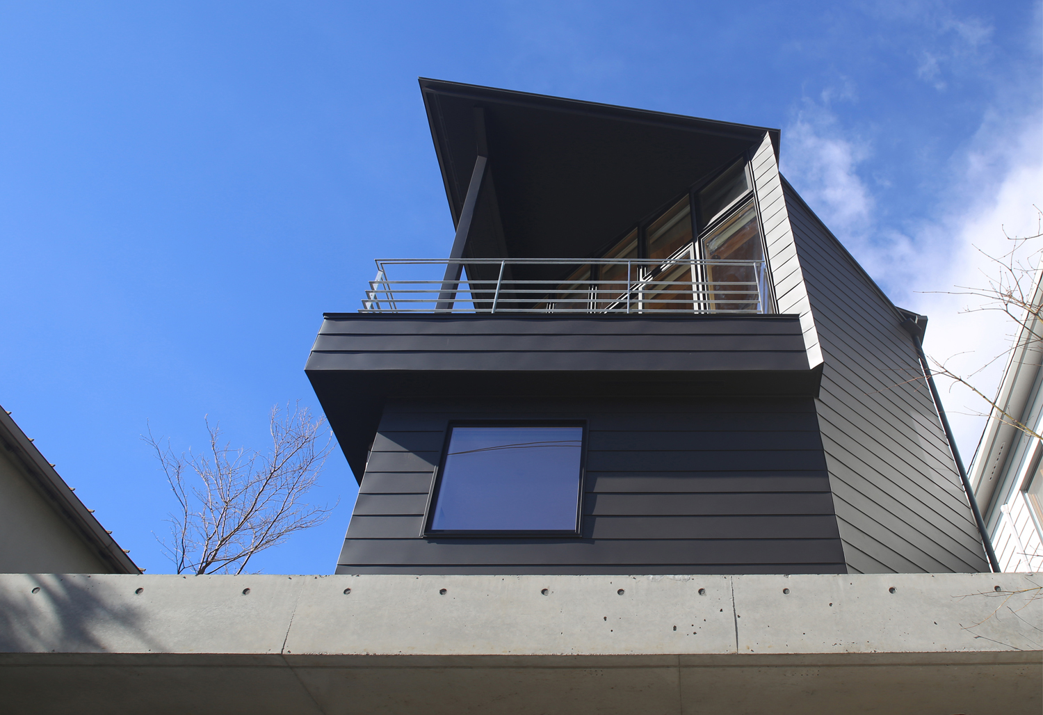 多摩川に下る急な坂のひな壇状の敷地に建つ家です。