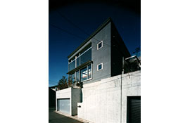 遠方に海を望む、急斜面を造成した丘に建つ家です。