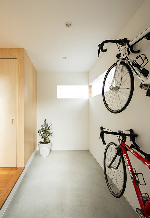 - ゆったりとした住宅地に建つ住まいです。明るく開放的で風通しのよい空間である一方で、プライバシーや防犯性の確保にも努力しています。