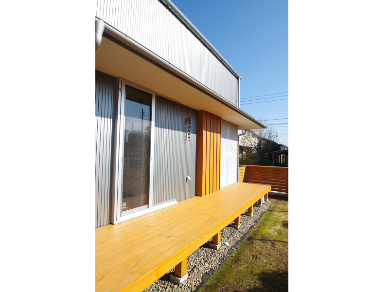 - 外観は銀のガルバリウムでシャープに、内部は珪藻土、無垢フローリングで自然素材に包まれ、