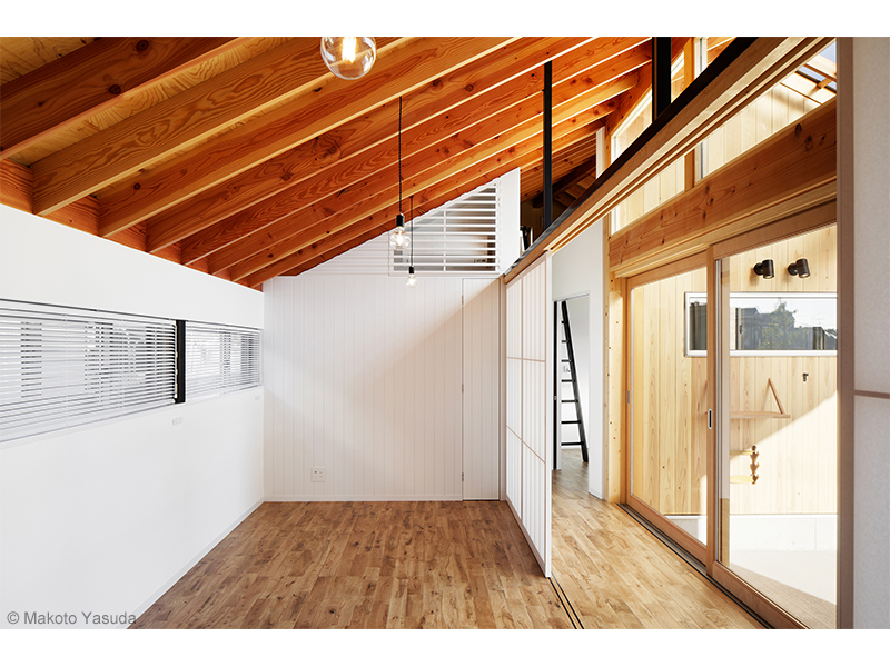 | 設計・デザインのポイント | 生活の場となる居場所と、内と外の行き来がしやすい、半屋外の光土間を用意して、 長い屋根の下に一緒に並べて配置する平屋の住処を構想しました。 そしてこの長い屋根を、わずかに、ゆるく、曲げました。 曲がったその先は、空間を移動することで、見えたり・隠れたり。 室内風景の遠近感や視界変化の楽しさ、 それと、伸びのある大らかさが、少しだけ加味されました。 |