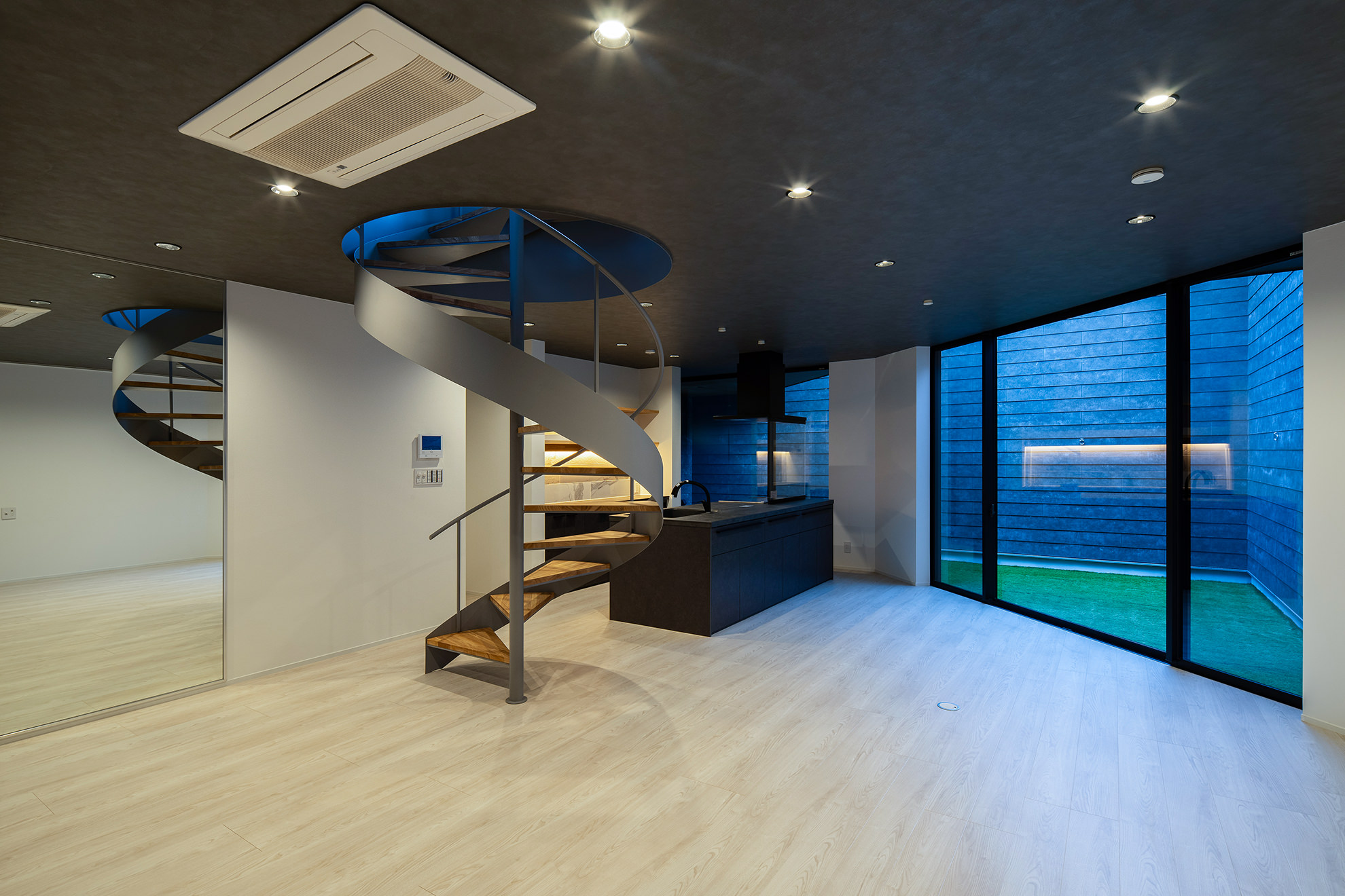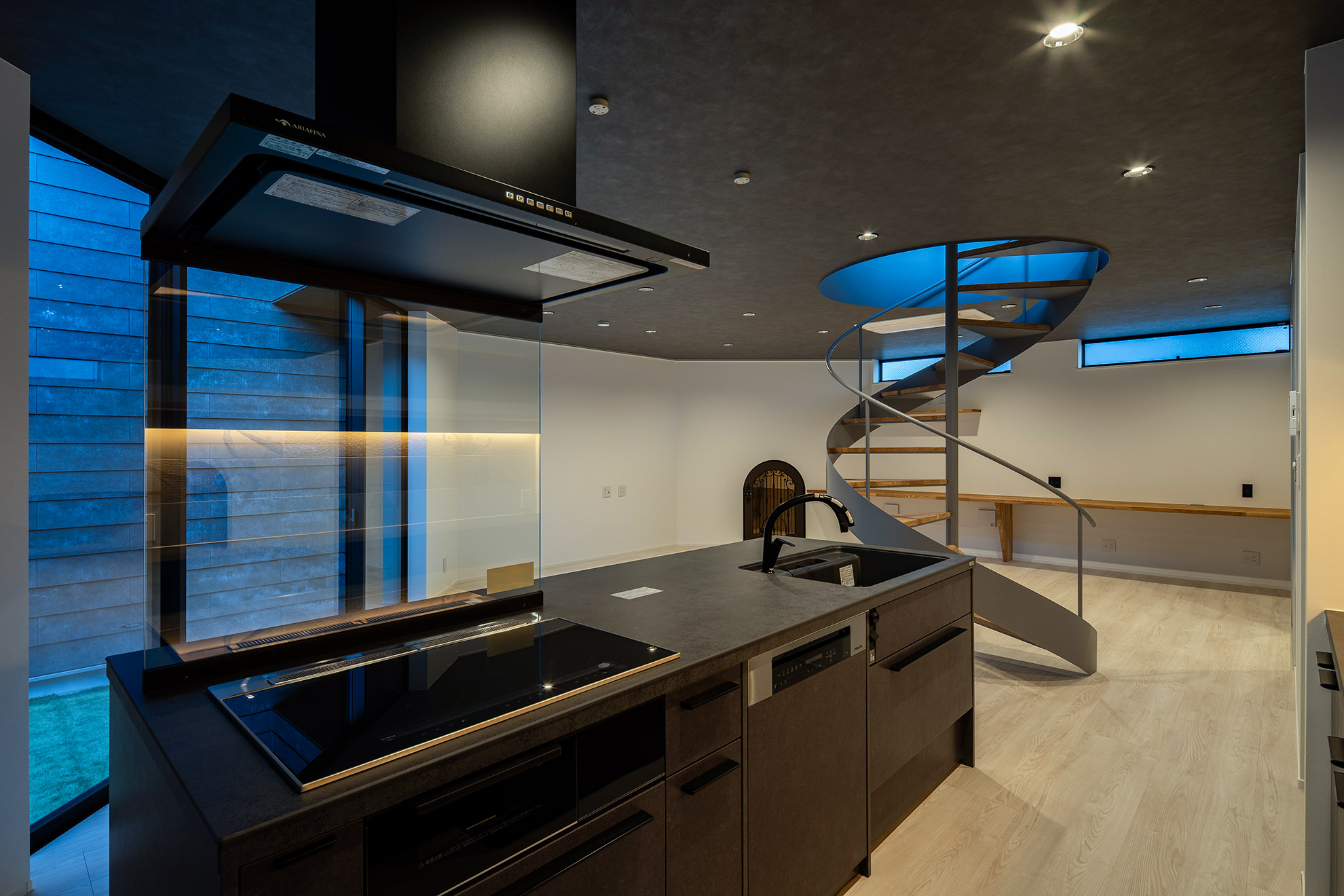 リビング・ダイニングに設置した螺旋階段からは2階空の光が室内を照らし出だします。