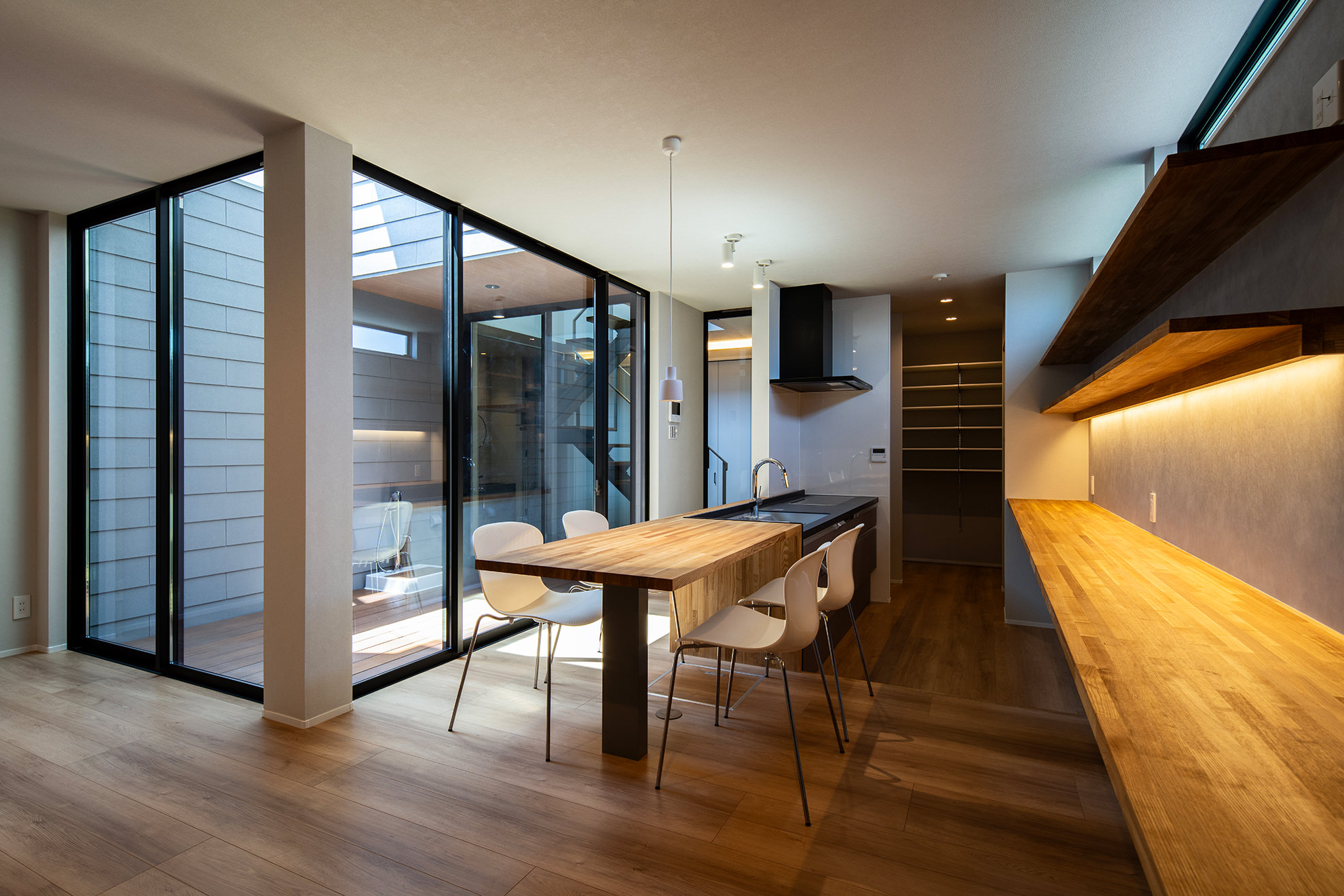 LDK約16帖からウッドデッキに段差なくアプローチでき、体感的には中庭も含めると20帖以上の広さを感じます。セカンドリビング・アウトドアリビングのイメージのある中庭です。キッチンで作業をしながら、中庭で遊ぶ子供の様子を常に確認できるようキッチンレイアウトを行いました。