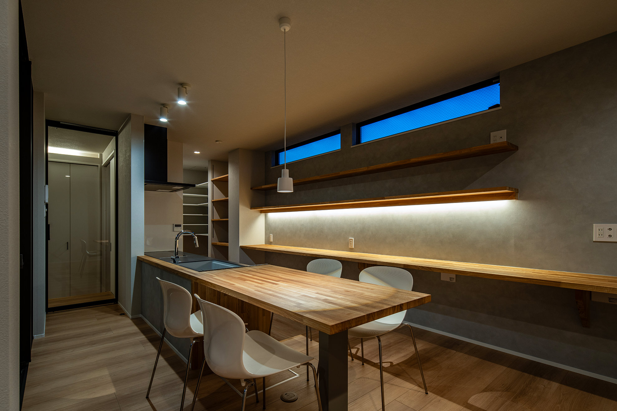 | 設計・デザインのポイント | プライバシーを意識し、中庭の2階レベルの外壁面には採光を促す大開口を設けるなど、限られた面積で工夫をしながら光や風のシミュレーションを行い、内部からは(空)を切取るような視覚イメージでフレーミングされた青空と外壁のグレーが淡いコントラストで映える色彩に配慮。吹抜の階段室は、採光通風と視覚効果を意図。壁面反射による採光なども含め中庭スペースを介した柔らかい光がLDK空間や2階居室へ差し込むイメージ。 | ||