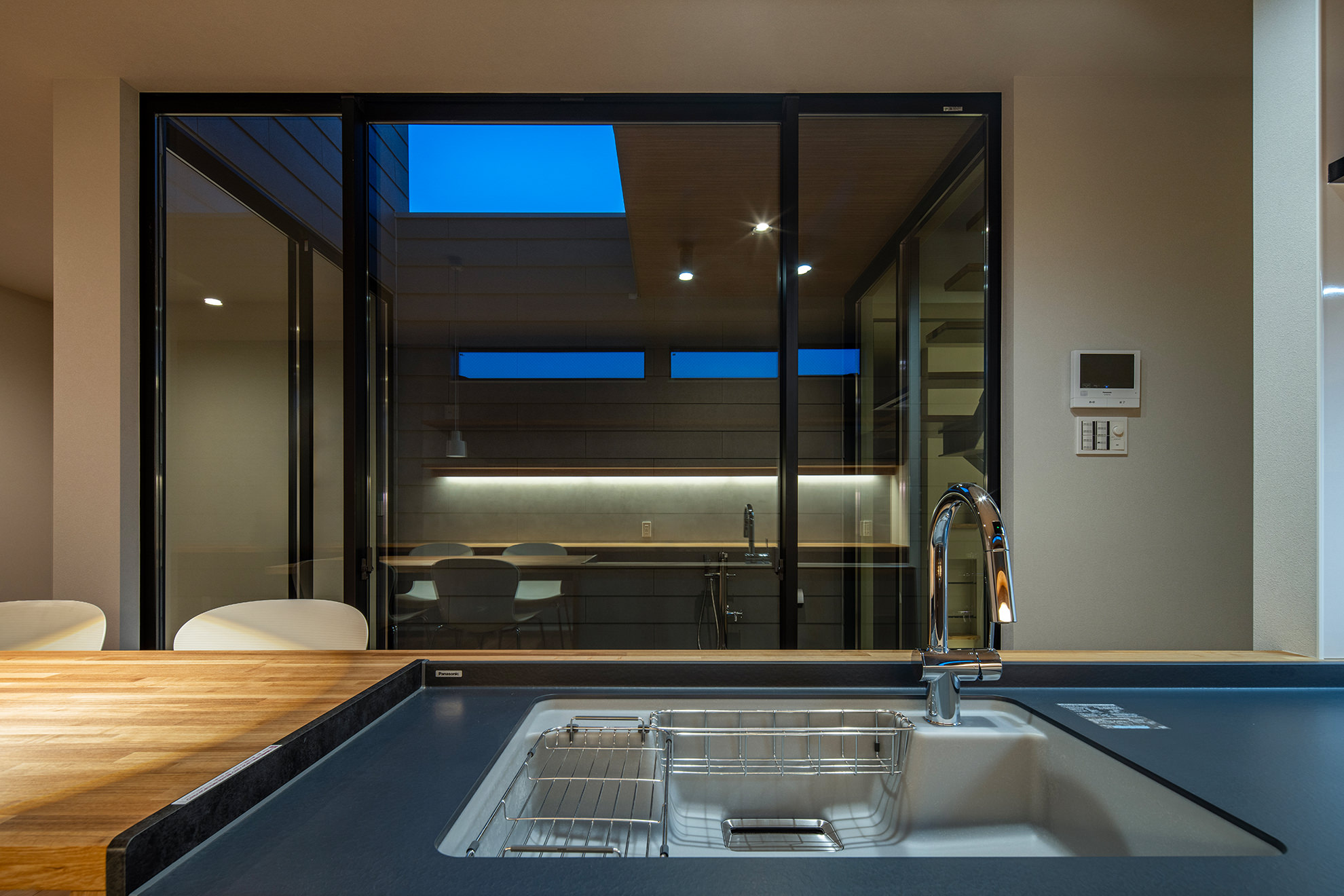 キッチンで作業をしながら、中庭で遊ぶ子供の様子を常に確認できる -