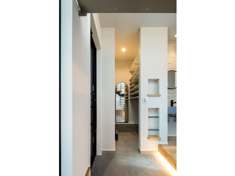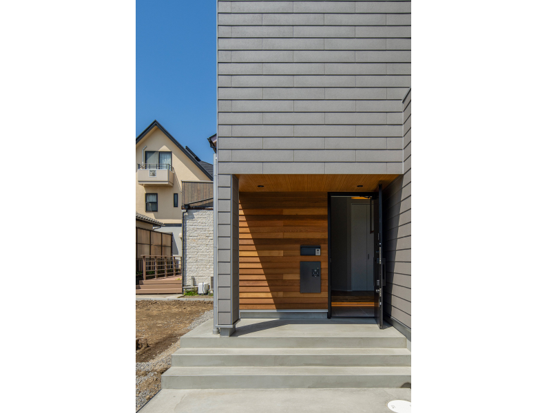 玄関は天然木下見張りで全体のアクセント[玄関]