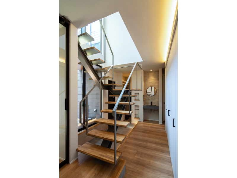 吹抜の階段室は、採光通風と視覚効果を意図し、スケルトンなイメージでデザイン