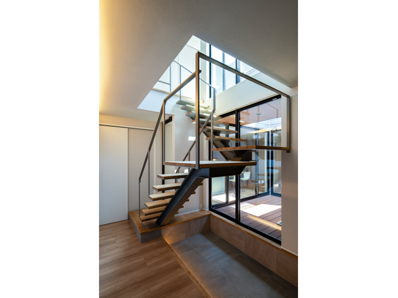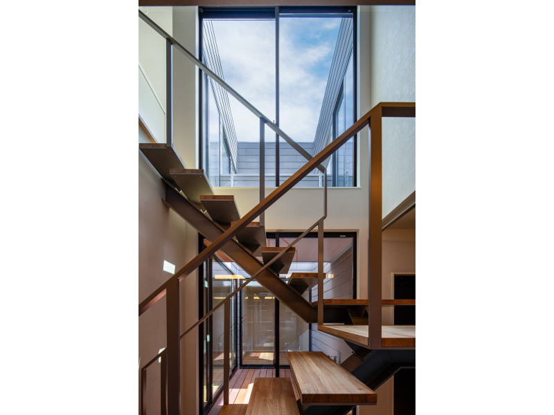 吹抜の階段室は、採光通風と視覚効果を意図し、スケルトンなイメージでデザイン