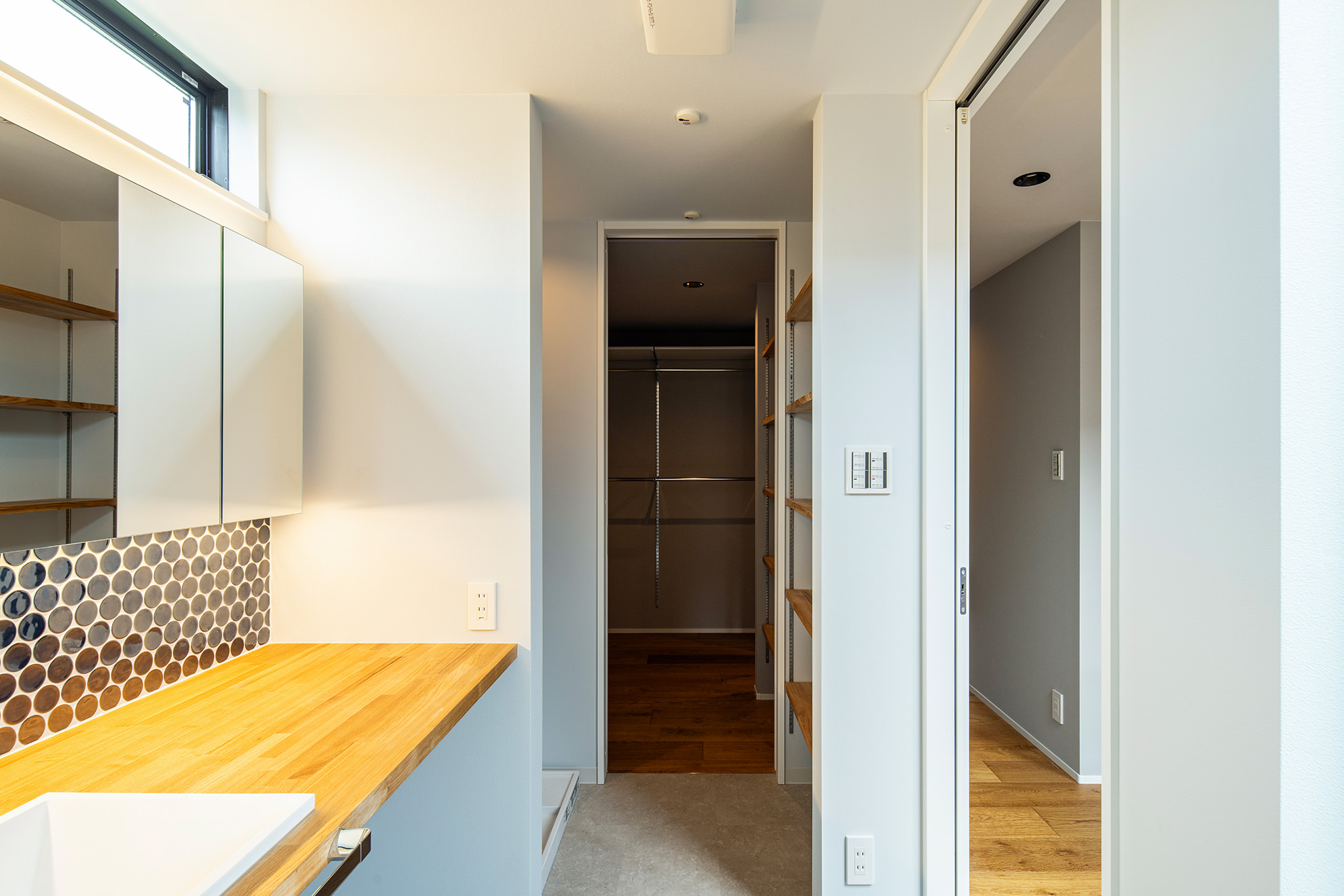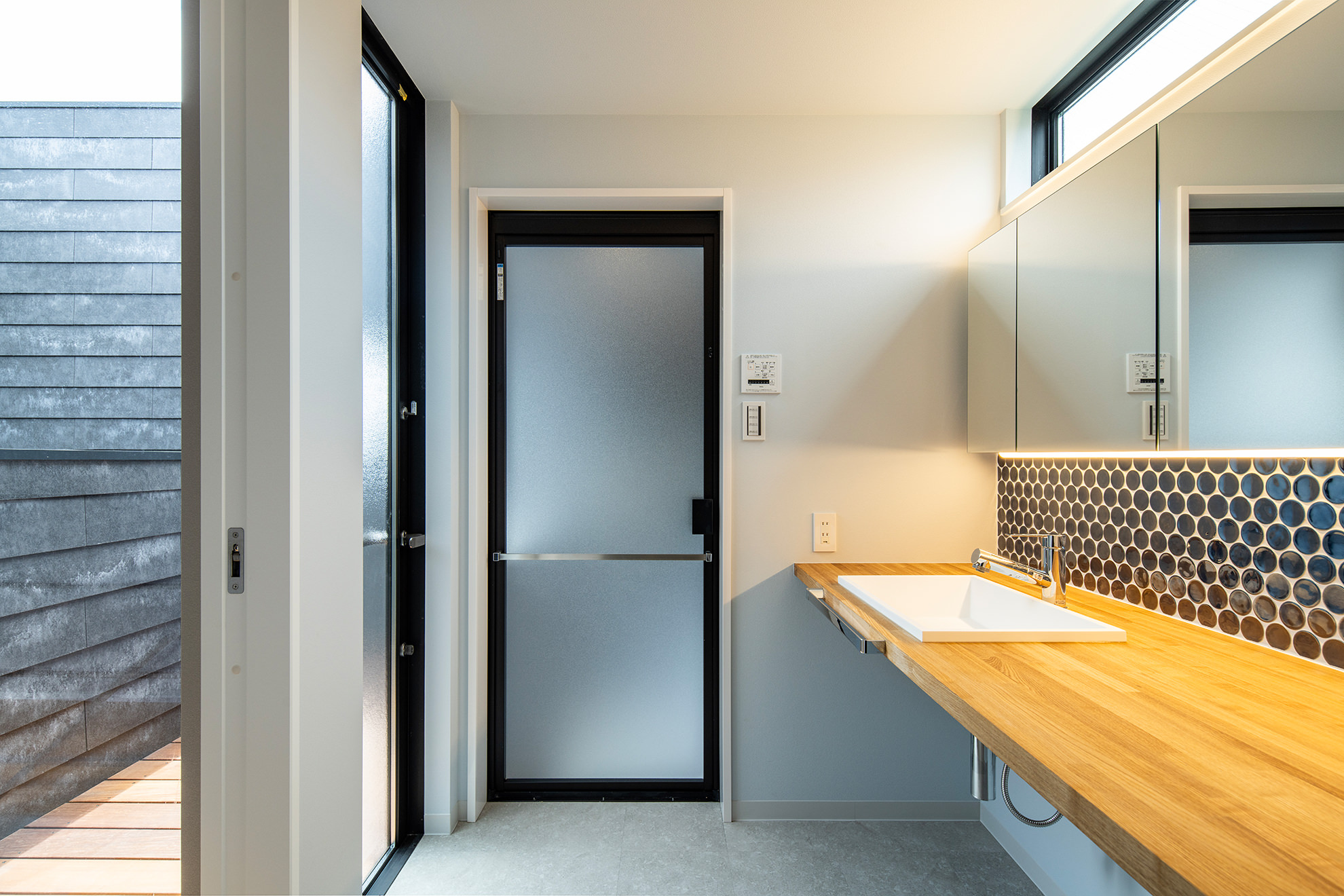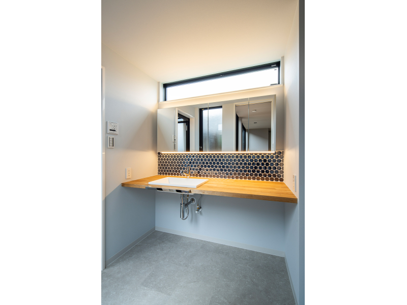 ブルーの丸タイルとタモ無垢材オリジナルカウンターがアクセントの洗面室