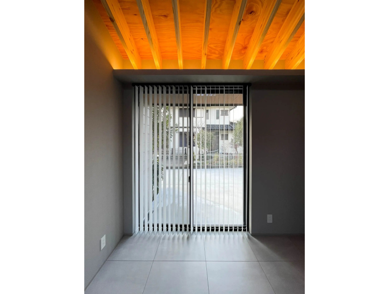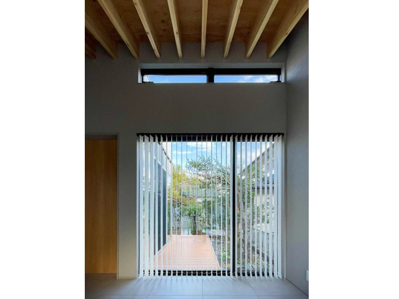 アプローチの軒庇から続くこの天井が、柔らかな木質感とともに空間にリズミカルな表情