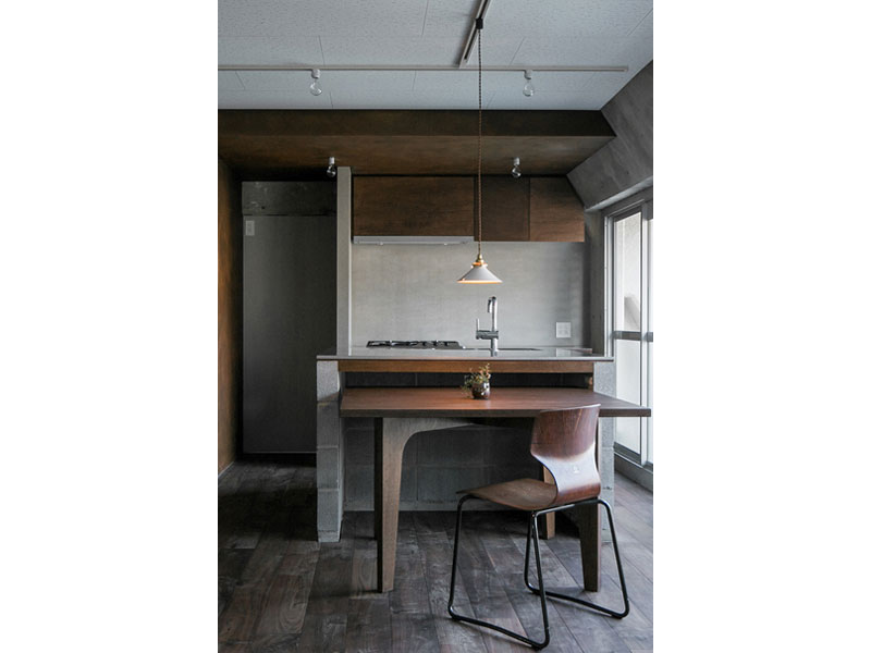 | 設計・デザインのポイント | 素材感あふれる空間をテーマに、炭入モルタル、コンクリートブロック、足場板、鉄粉の錆塗装、ブラックウォールナットの無垢フローリング、バイブレーション仕上げのステンレス板、ラワン合板などなど、個性あふれる素材を適材適所に使い分けています。また、コンクリートの構造体には敢えて塗装などの仕上げを施していません。一部、壁紙の下地であったモルタル壁に白いパテの痕も残りますが、これも味として敢えて残しています。 | ||