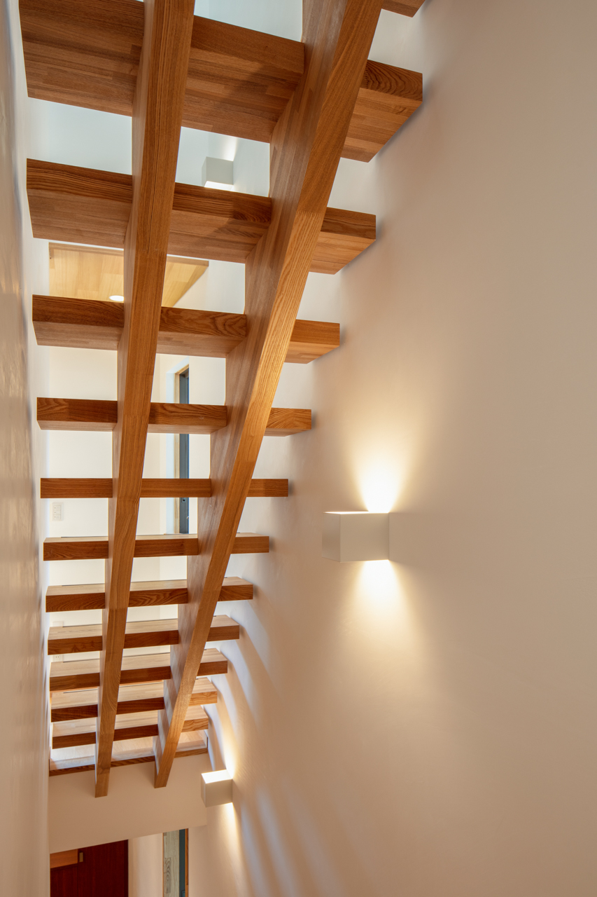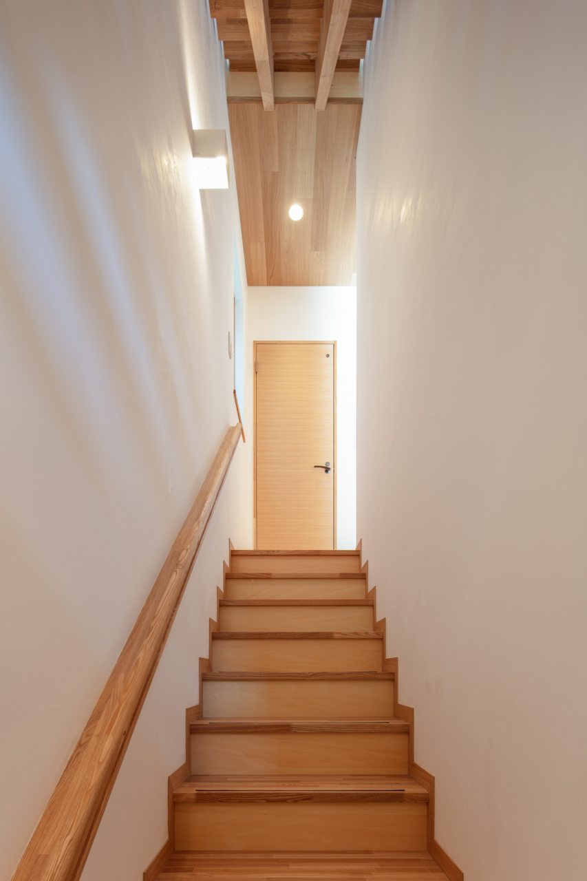 | 使用した住設機器・資材 | ノンスリップ:ネオプレンゴムφ8半埋込み、手すり:タモ集成材t30×70加工、 段板、ささら桁:タモ集成材t60㎜ |
