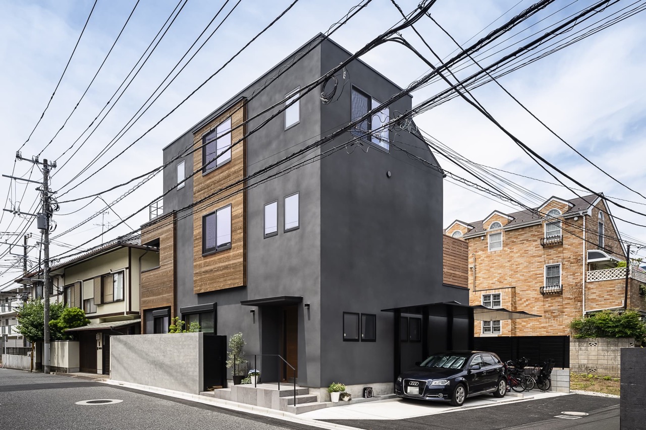 | 設計・デザインのポイント | 建主が、かつて過ごした生家の建替えプロジェクトです。建て替えにあたって、元の地所を分割し、40坪ほどの南東の角地を敷地としました。ここに、若夫婦+子供2人と母の二世帯住宅を計画しています。構造はSE構法による木造軸組工法で、外壁は杉板(杉T&Gパネル ウィルウォール)とジョリパットのコンビネーションです。若夫婦世帯の2階のLDKには3階子供室や納戸が面するL字型の吹抜けを作っています。 |