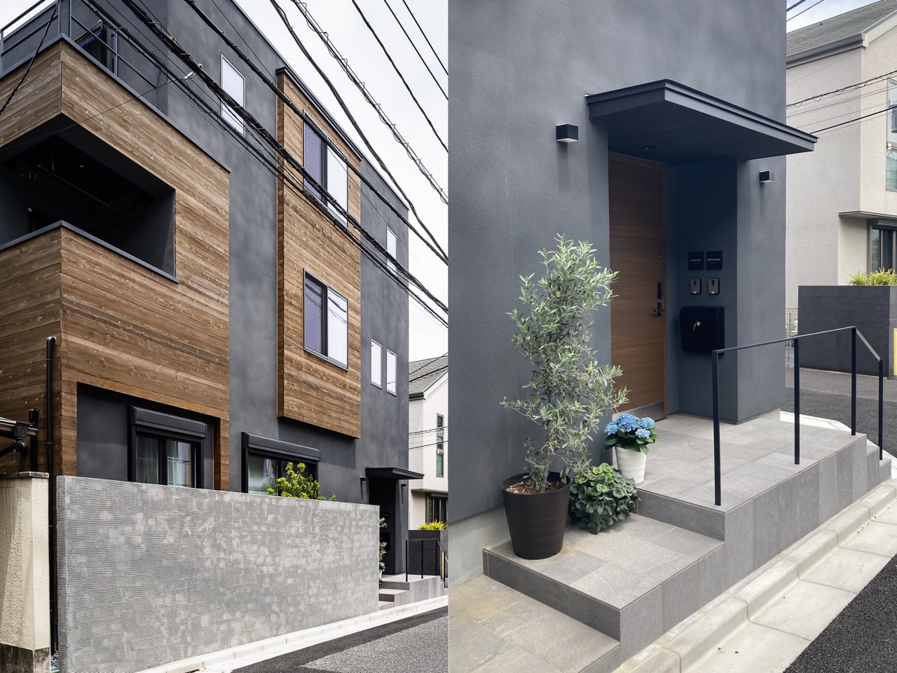 南東側外観。外壁は存在感のある濃灰色の塗り壁と、アクセントの杉板横張りの組合せ -