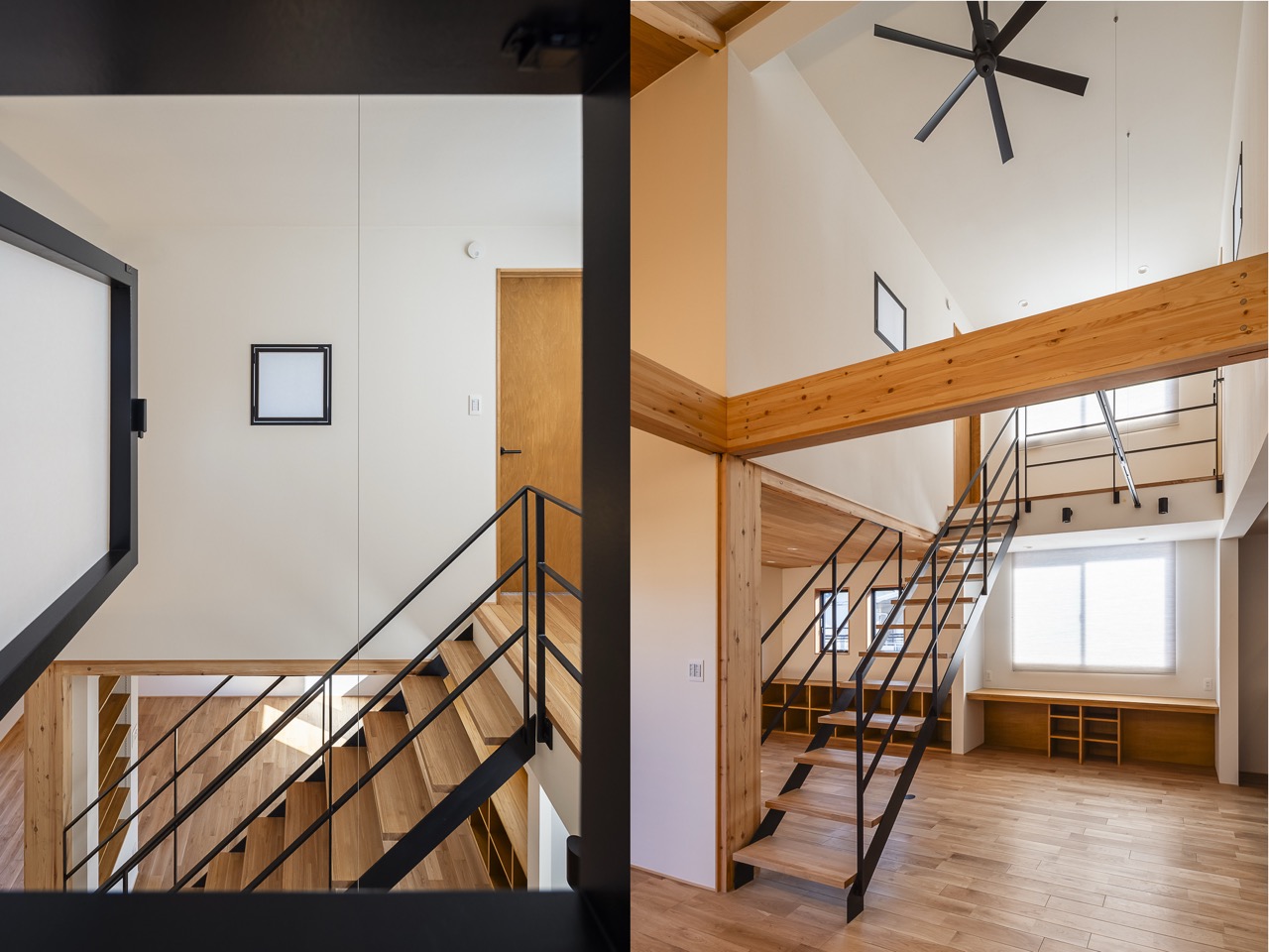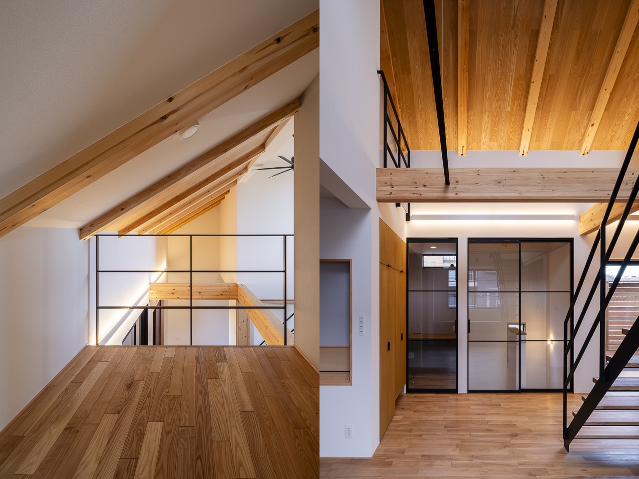 左/吹抜に面した小屋裏納戸は秘密基地。右/左はワークスペース。右は階段室 -