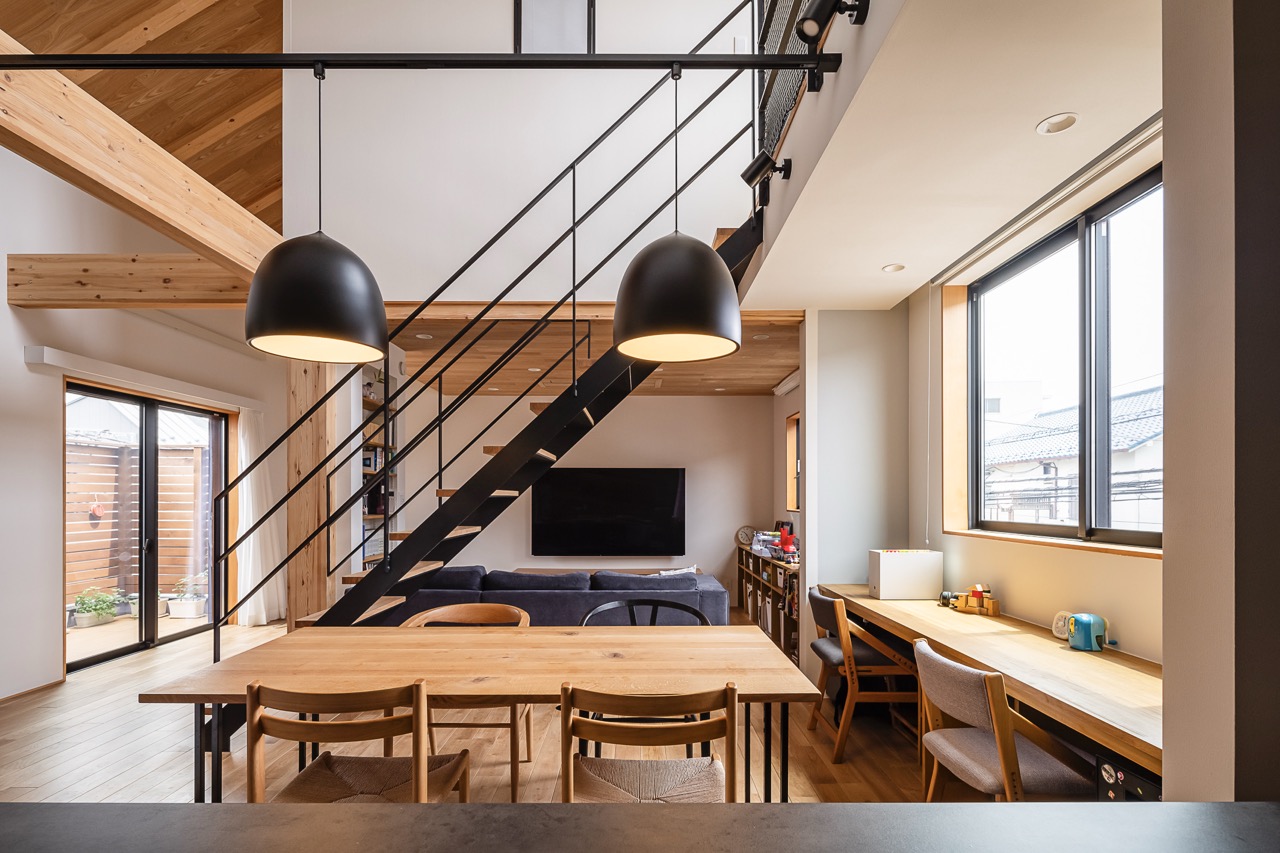 2階リビングからダイニングキッチン方向を見る。吹抜を上っていくスチール階段 -