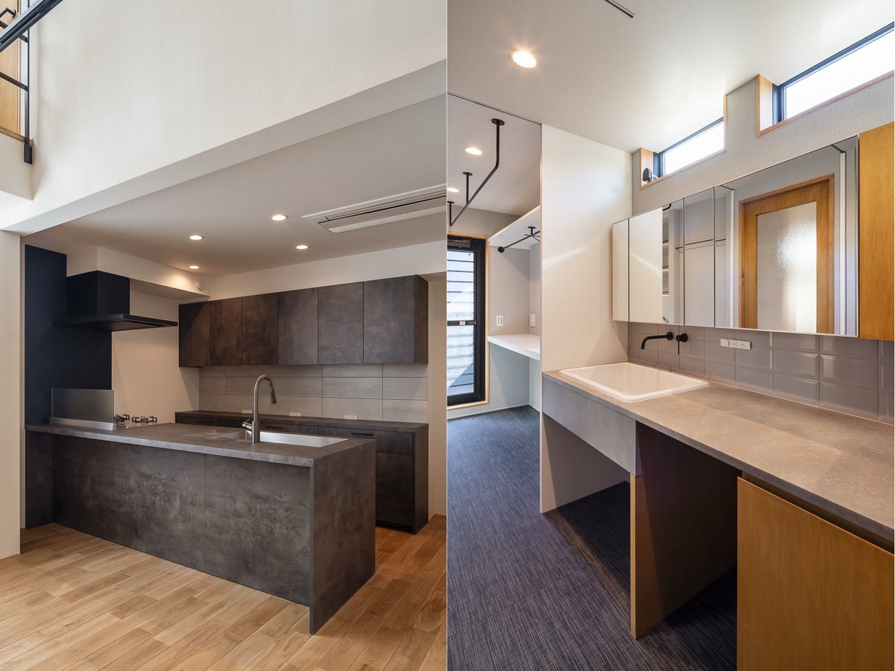左/対面キッチン。右/キッチン裏手は洗面室と家事室と効率的な家事動線 -