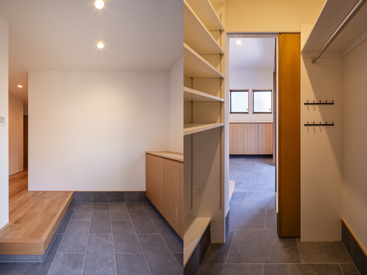 左/2世帯共有の玄関。右/上足と下足の2方向アクセスのシューズクローク -