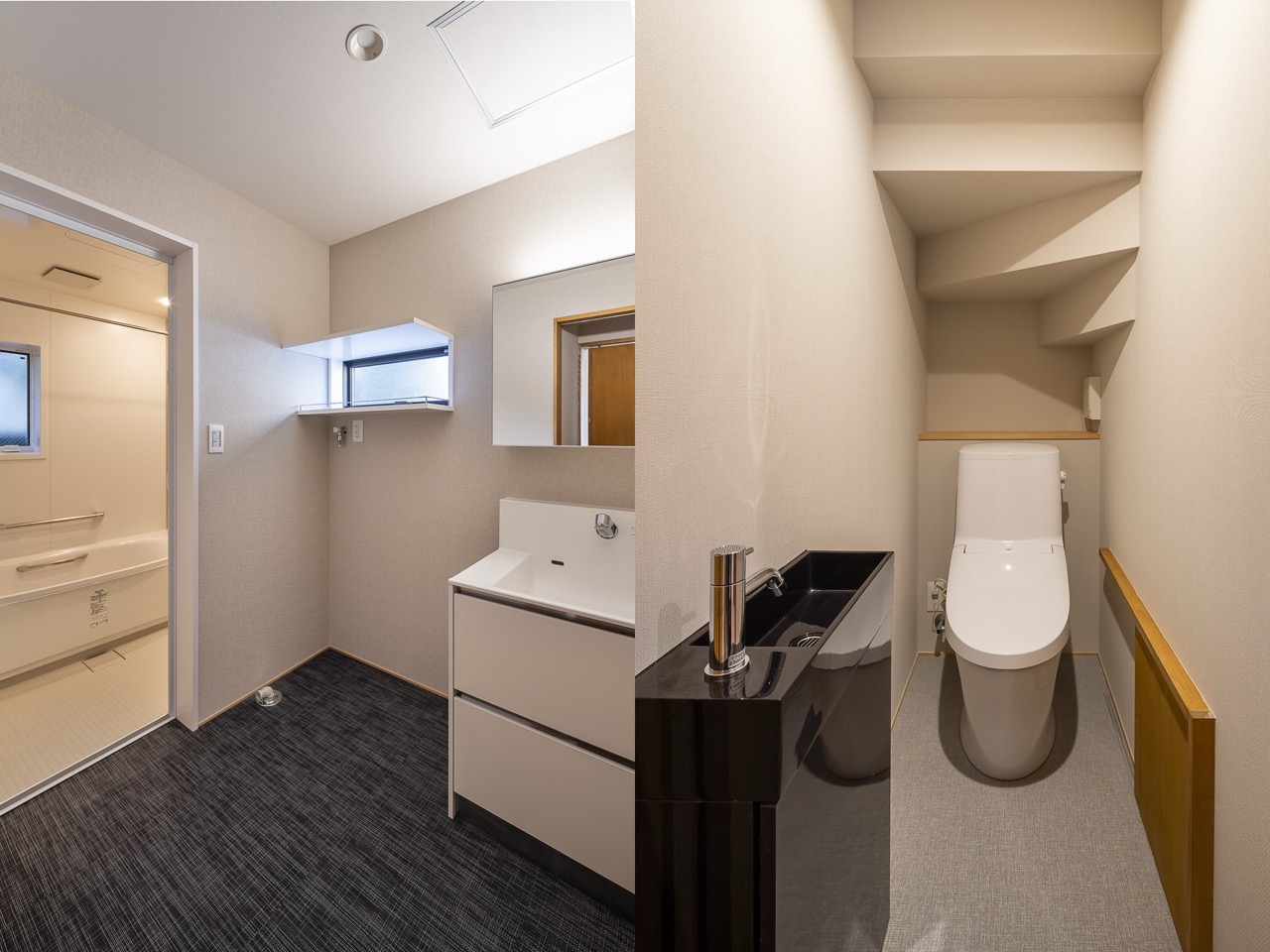 1階親世帯用の洗面室と、階段下を利用したトイレ。将来親世帯の賃貸想定の設備