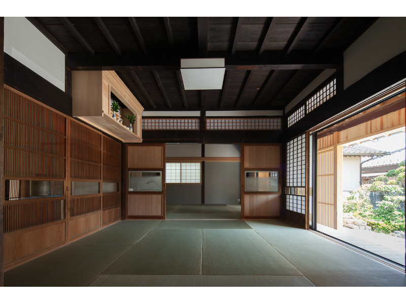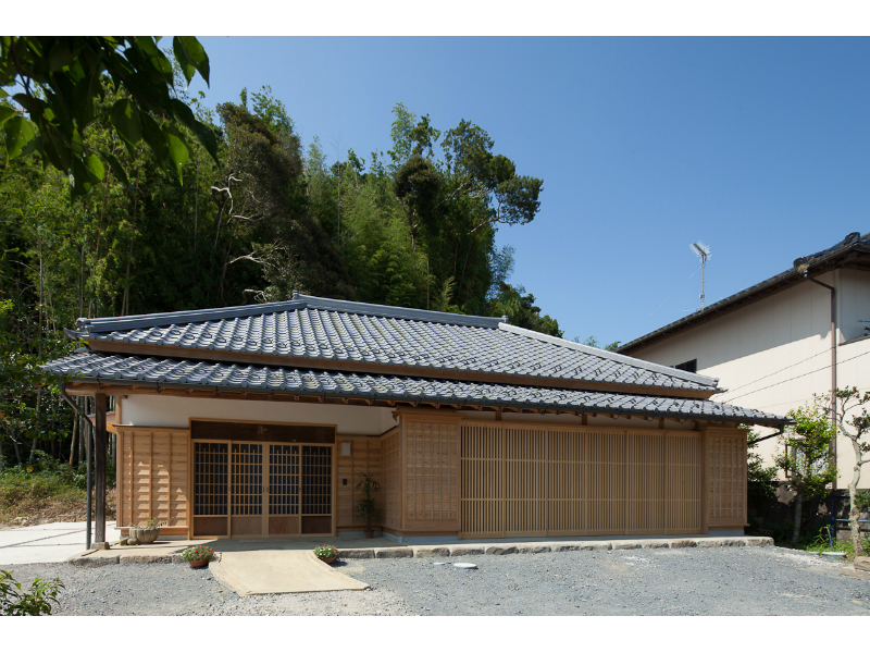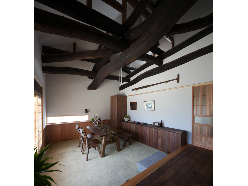 | 設計・デザインのポイント | 外観は、古民家の良さを残しながら、和風モダンのデザインを採用。 内部は古民家がもつ貴重な資源を多く利用。 古くから残る太い梁の力強さを表現し、地域の人々を迎い入れる土間を広げ、急な来客へも対応ができるように計画。 古くから残る和室は、天井板や梁、建具などを再利用し、元の雰囲気を残した空間に。 内部家具は、納戸に眠っていた家具を現在の暮らしに合うようリメイクしています。 |
