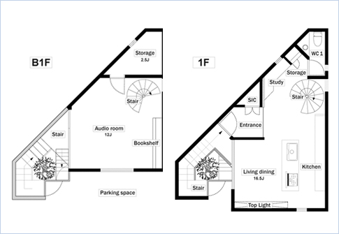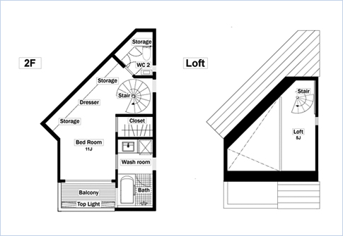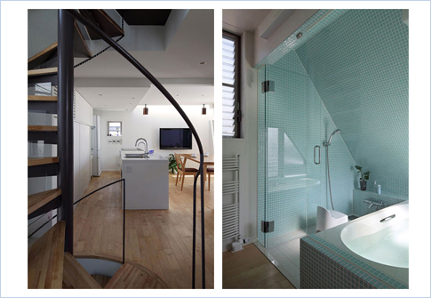 今回の敷地は三角形でしたので、敷地の形状に合わせて建物も三角形にしました。こうした変形の建物はハウスメーカーや工務店では対応できないケースも多いので、建築家の腕の見せ所と言えるでしょう。屋根も斜線制限に合わせて斜めにカットし、狭くなった屋根下のスペースに浴室を配置しています。また、廊下や階段などの「移動のためのスペース」を最小限に押さえるため、螺旋階段を採用しています。