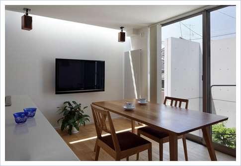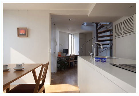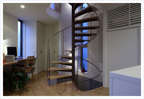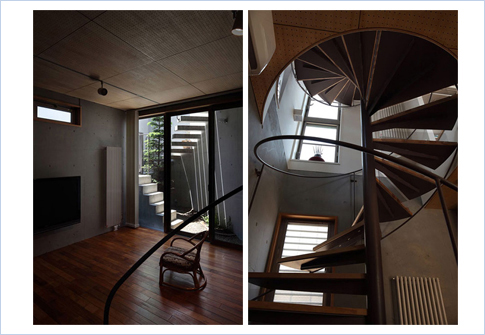 狭小地での設計で重要なのは、建築家と建て主さんがじっくり話し合うことです。狭小地は利用できるスペースが限られていますから、当然、建て主さんの要望をすべて実現することが難しいケースもあるでしょう。だからといって、「スペースがないので無理です」と、即座にはねつけてしまうようでは、建築家の存在意義はなくなってしまいますよね。きちんと話し合い、どうしたら理想の住まいが実現できるかを一緒に考えることで、小さな土地でも驚くほど快適な家づくりは可能です。そのために、たとえば、螺旋階段を使う方法は有効です。通常の階段より省スペースで設置でき、空間のアクセントとしての役割も果たしてくれます。また、「動線を考えた窓の配置」という方法も効果的です。各シーンで、住まい手の視線がどこに向くのか?を考えてその先に窓を配置すれば、限られた空間でも広さを感じることがでるようになります。もちろん、やみくもに窓を設けてしまうと、今度は外からの視線が気になります。そこで「南台の家」では、敷地の角にコンクリートの壁を立ち上げています。これは、外部からの視線を遮るだけでなく、日光を反射させて室内に取り込む、反射板のような役割も兼ねているのです。スペースの限られた狭小地では、このように1つのアイデアにたくさんの解決方法を盛り込むことも大切になります。
