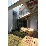 中庭に設けられた1階のデッキ。2階にも同様のデッキがあり、各室と外部空間をつなぐ