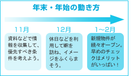 早期の契約の方が条件のいい部屋に出会える確率は高い。一般的に、不動産の繁忙期は2・3月と9~11月といわれている。そのため、年初の繁忙期が始まる2月に多くのMRがオープンし、新規発売の物件も続々登場する。年末・年始にしっかりと準備をしておけば、きっと満足のいく住まい選びができるはずだ。 |