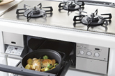 調理油に<自然発火防止>、吹きこぼれに<立ち消え安全装置>、消し忘れに<自動消火機能>が働く「Siセンサーコンロ」で安心。
