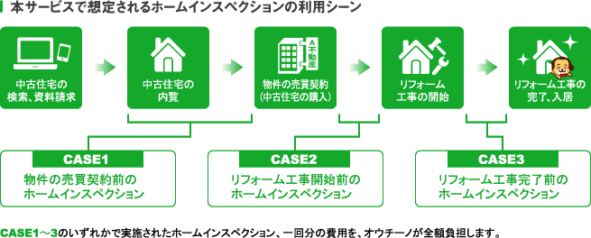 中古オウチーノに掲載されている中古住宅に資料請求をし、購入後にリフォーム・オウチーノを利用して税抜金額100万円以上のリフォームを行った場合、その間にお客様が実施したホームインスペクション(※当社指定会社による)費用を当社が負担するものです。費用負担のお支払いにあたっては、当社指定のアンケートにご回答いただく必要があります。
