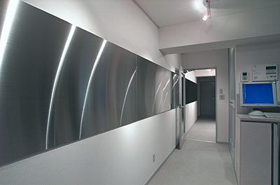 - 壁面収納は全体のバランスから幅広のもので壁面全体でなく、宙に浮いた2つのボックスでまとめました。また、全体の統一感とコンセプトイメージを与えるために廊下から続く14mの壁面に着目し、ここにステンレスパネルを採用しました。