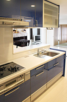 | リフォーム内容 | 間仕切り壁・天井などの内装からユニットバス・流し台などの設備機器までコンクリート躯体だけを残したスケルトン状態にし、リフォーム前のいろいろな問題点を改善。室内カラーをホワイトをベースに、キッチンはブルー、リビングはダークブラウン、和室をナチュラルと、スポット的に分ける事で空間にそれぞれの個性をもたせました。 | ||