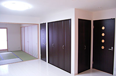 ドアの色をダーク系のブラウンにし、和と洋の調和を図っています