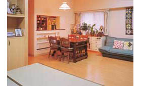 - 色と材質をフローリングと合わせた大型収納棚。組合せが自由にできる収納畳ユニットは落ち着ける和風コーナーにもなり、大量に収納できます。