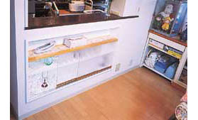 キッチンカウンターの側面をくり抜いて、造り付けの食器棚を設置