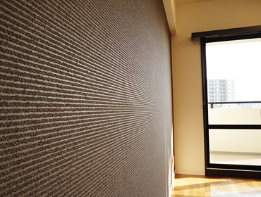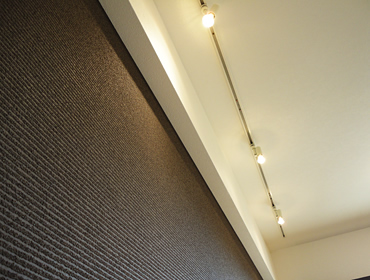 リビングの一面に素材感のあるダークブラウンのクロスを張り、部屋のアクセントに。壁際に配されたスポットライトが光の陰影を創り出すように工夫しています。