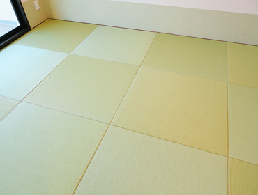 - 縁なし正方形の畳(目積畳)を、編み目が交互になるように敷いてモダンな空間にしました。壁紙・フスマを若草色と白のツートンカラーで貼り分けて、和室の印象を爽やかに。