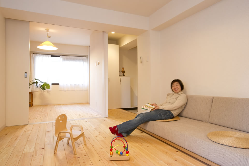 | 使用した住設機器・資材等 | 床:国産無垢フローリング(さわら) キッチンカウンター:桧無垢板(オスモ自然塗装仕上げ) 収納:集成材(イースタンホワイト・オスモ自然塗装仕上げ) 建具:EIDAI EDパイン 壁・天井:既存 |