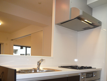 - リフォーム前は、キッチンは北側に奥まっていました。今回、リビングダイニングに対面式キッチンを導入。会話をしながらの調理も楽しめます。キッチンを既存の場所から移動したため、換気扇のダクトを外に出すにあたって、違和感なく天井に這わす工夫もしています。