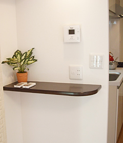 キッチンの入口には、電話も置ける棚を造作。棚の上部にはモニターホンもついているから、キッチンで料理していても、すぐに来訪者の対応ができます。
