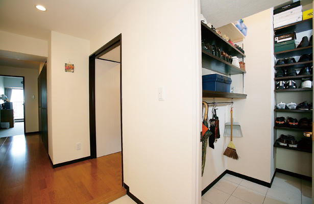 タイルのスペースを以前の約2倍に広げ、ゆとりある空間に生まれ変わった玄関。