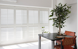 窓には強い風と日差しを和らげるためにウィンドウシャッターを取り付けることで、シャッターのやわらかい木の質感が穏やかなくつろぎの空間を作っています。