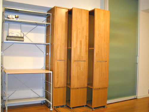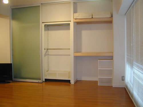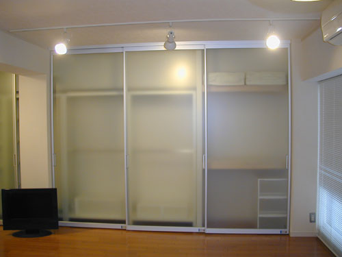 - 壁全面を収納とする事で収納量の確保ができました。また、半透明アルミ建具を使う事で、空間を軽やかに演出しています。