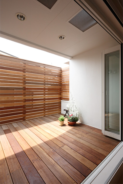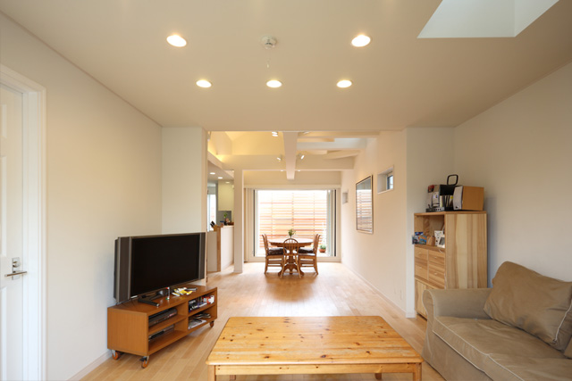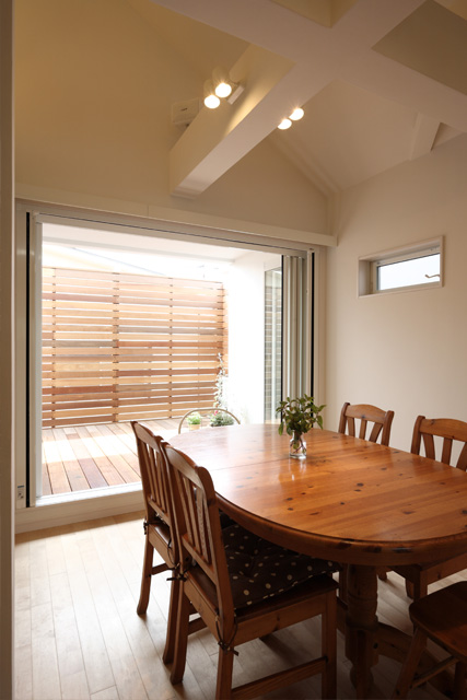 北から南に向けてリビング、ダイニングキッチン、ウッドデッキまで並ぶレイアウト